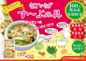 熊本産乾燥野菜(キャベツ、人参、玉ねぎ、小松菜)を使用したす~ぷの具です。 鍋に本品と水を入れ加熱し、お好みに味付けしてお召し上がりください。 熱湯で約3分で戻ります。 規格 36g 入数 30入 アレルゲン なし 保存方法 常温 賞味期限 6ヶ月 JANコード 4970063-115590 備考 本製品はえびを含むラインで加工しています。 ご購入はこちら→ ひごもん屋 包丁いらず みそ汁の具 前の記事 太平燕 うま辛海鮮味 5食入 次の記事